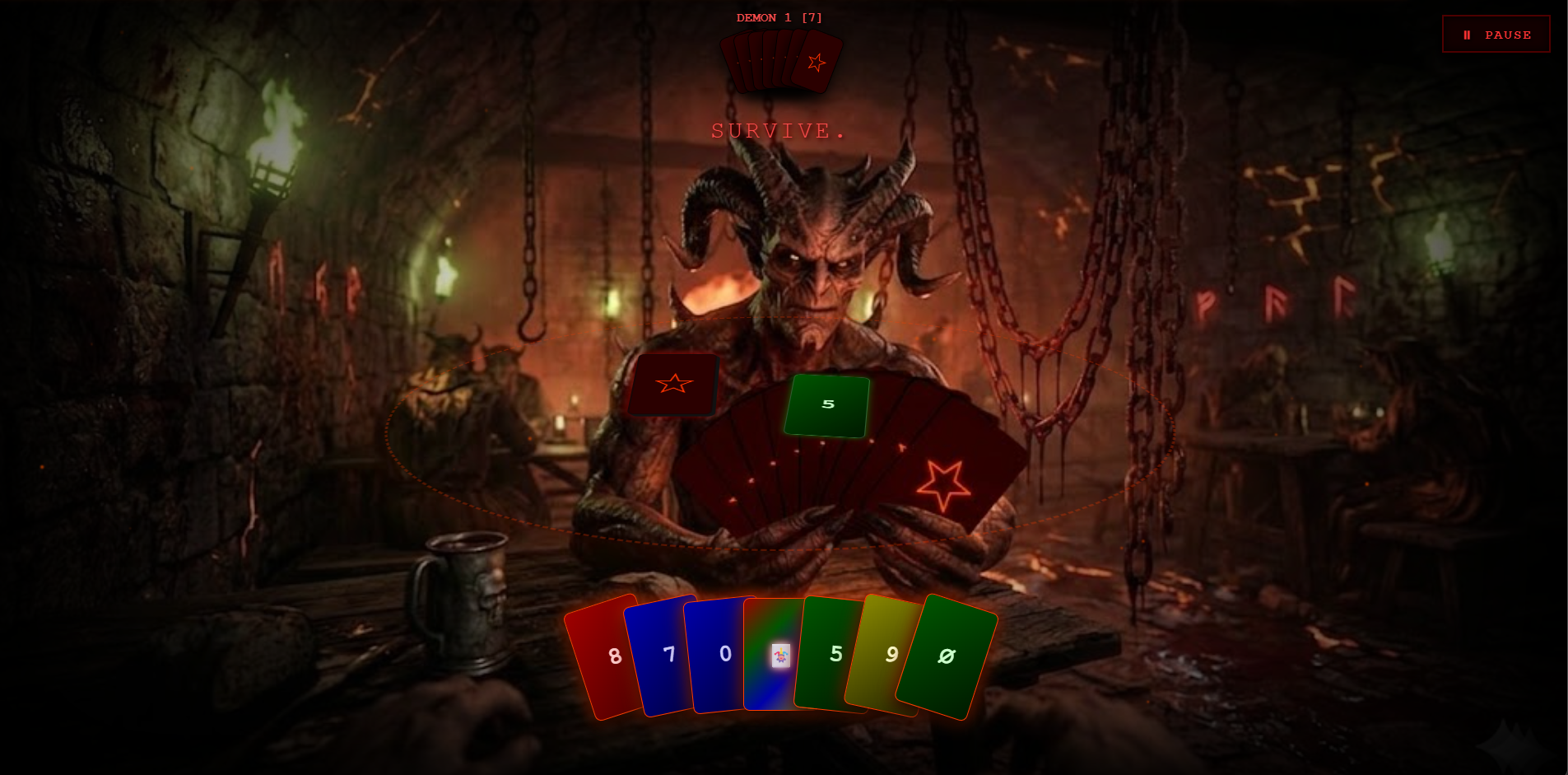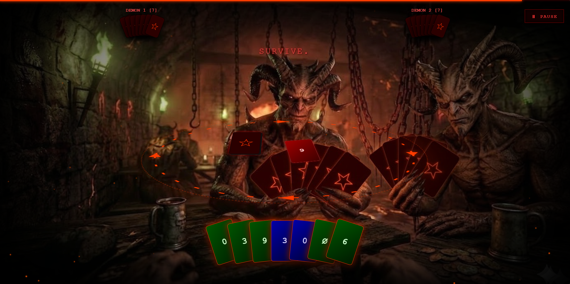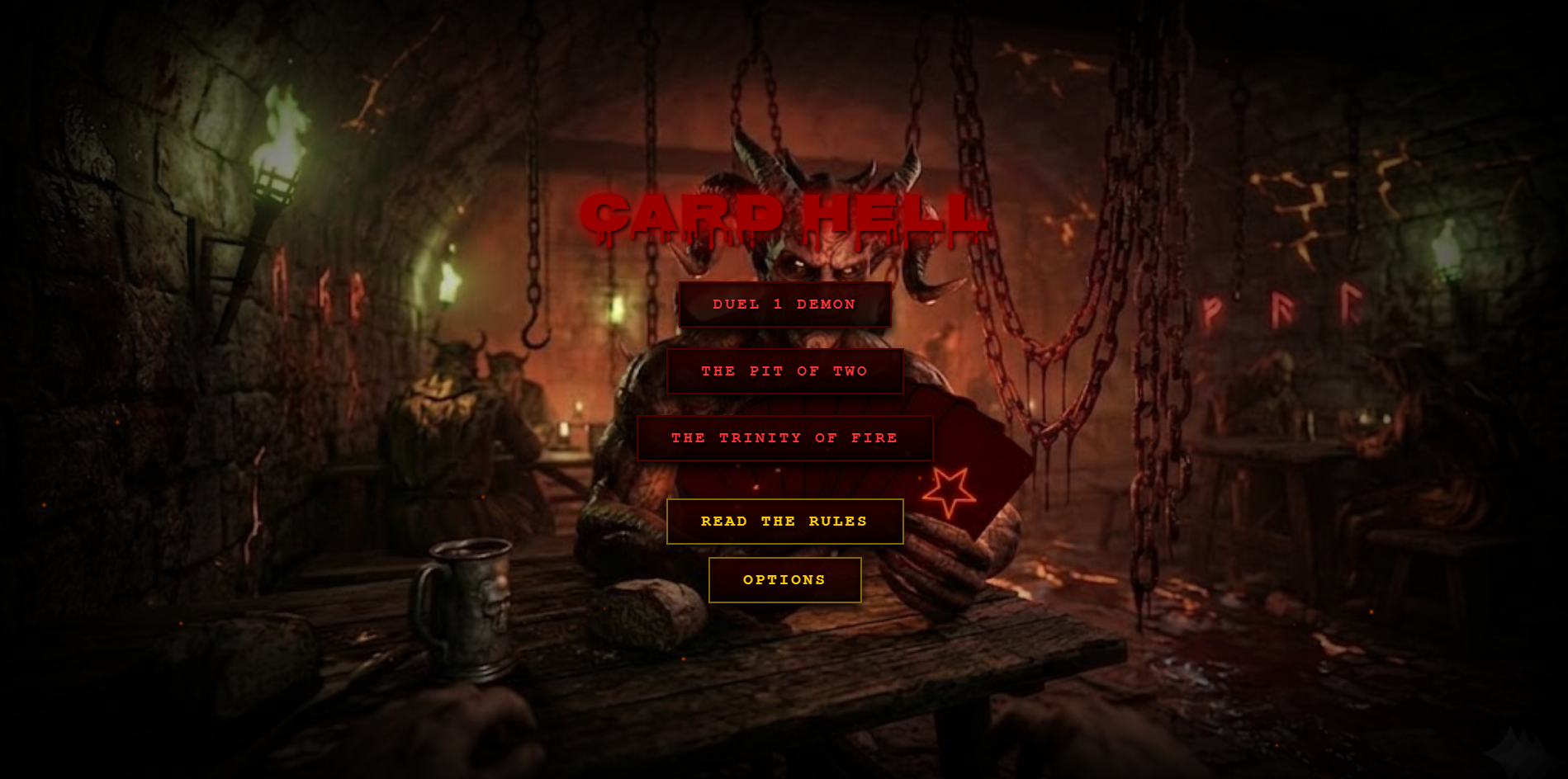 Card Hel is a fast-paced, demonic-themed card game that puts a dark and fiery twist on classic color-and-symbol matching games. The ultimate objective is to empty your hand of cards before your demonic opponents do, or you will forfeit your soul to the pit.