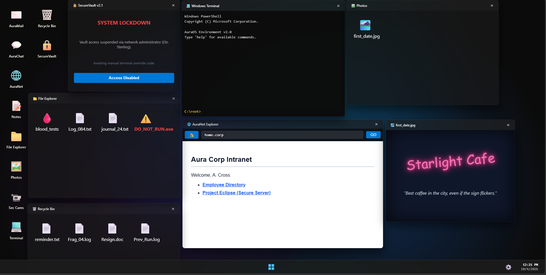 - Immersive OS Simulation: Navigate a fully realized corporate desktop environment. Scour your AuraMail, cross-reference your personal Notes, and browse the AuraNet intranet to piece together passwords and clues.